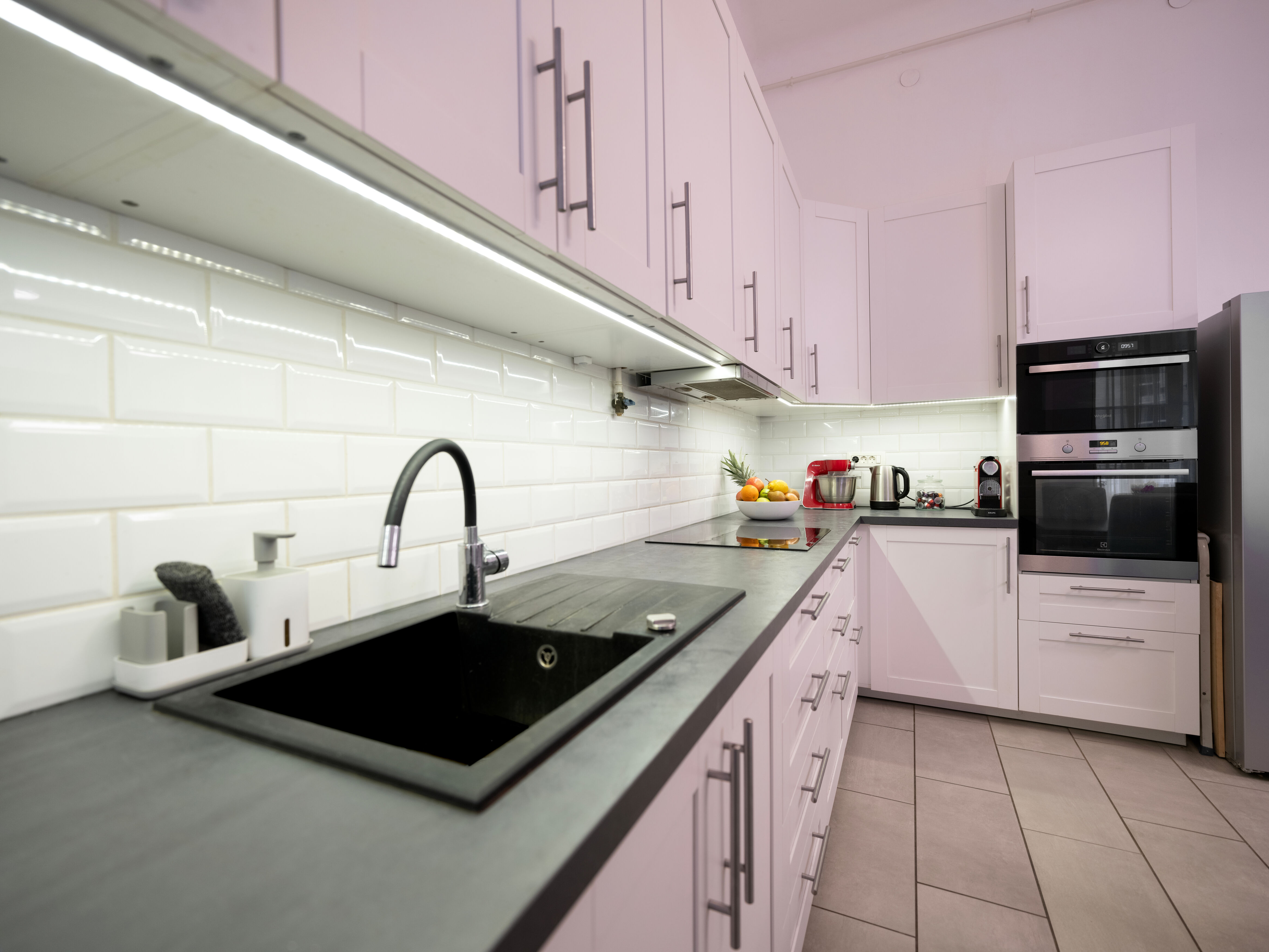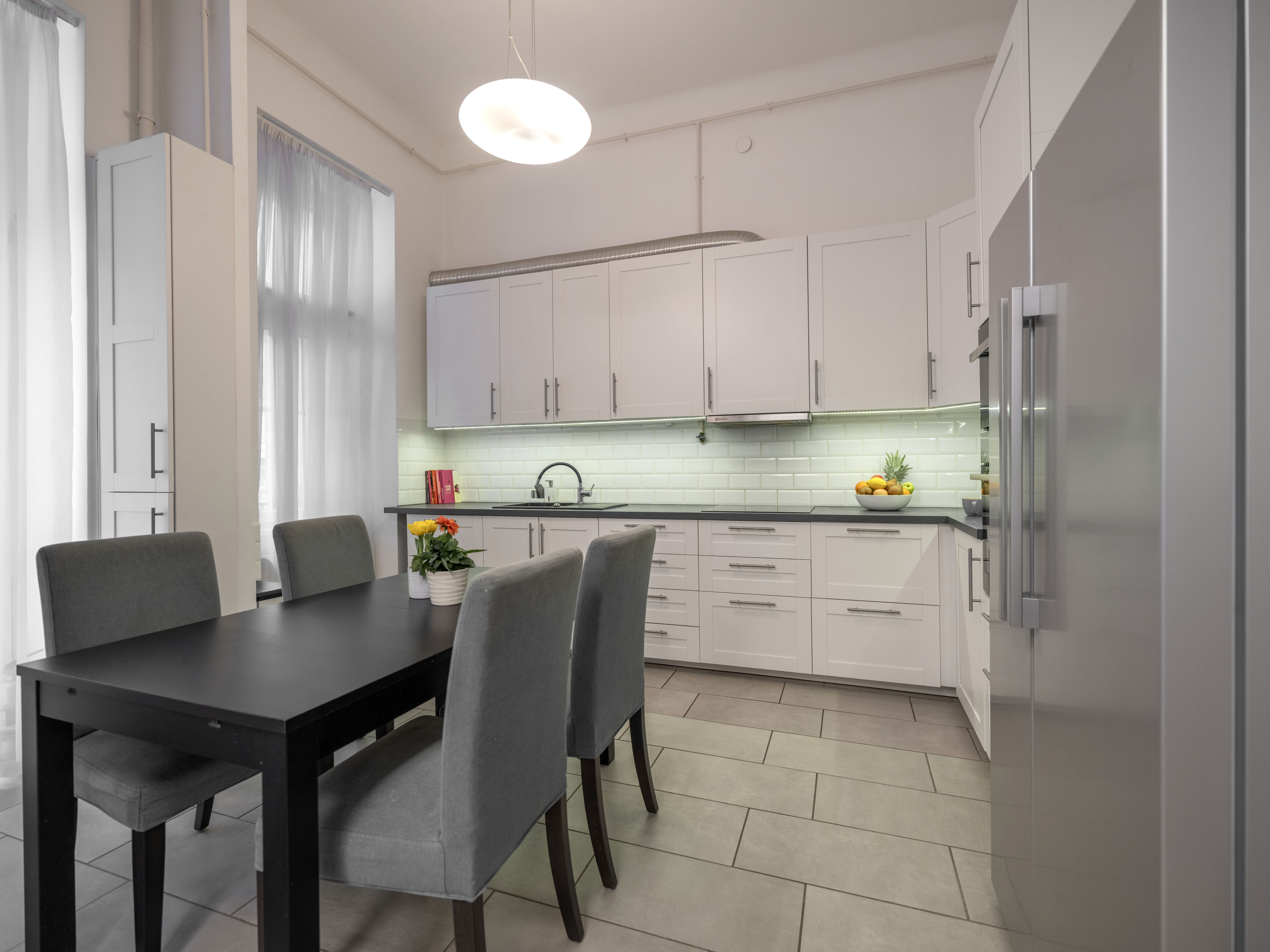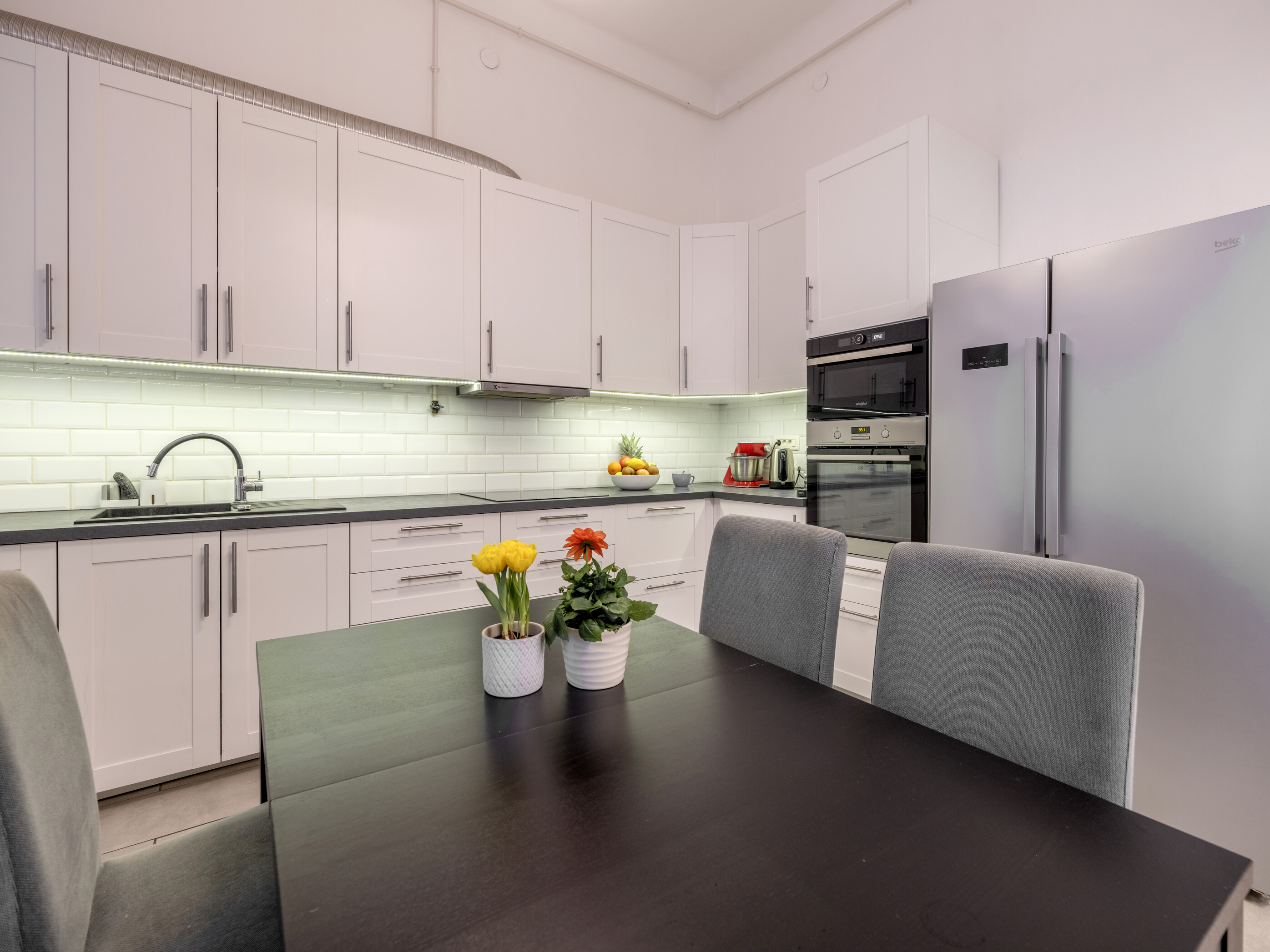 A nagyméretű konyha korszerű háztartási berendezésekkel felszerelt (sütő, mikrohullámú sütő, indukciós főzőlap, szagelszívó és mosogatógép), és persze helyet kapott benne a családi közös étkezések és baráti vendéglátás központi helye, az étkező is. Az ergonomikus munkavégzést többek között pultvilágítás, flexibilis csap biztosítja, és mert a tárolóhelyből sosem elég, megfelelő mennyiségű szekrénnyel szereltük fel.