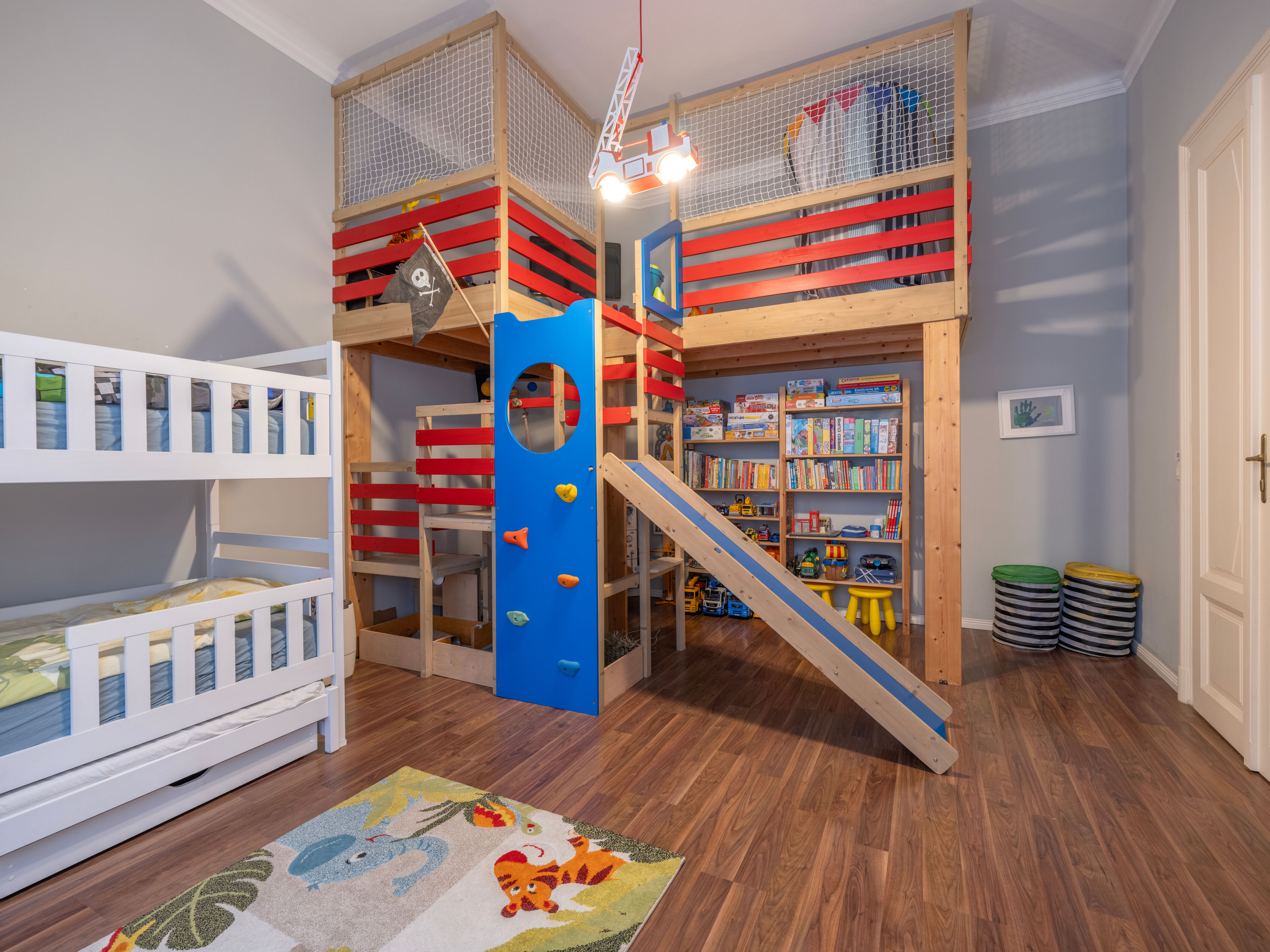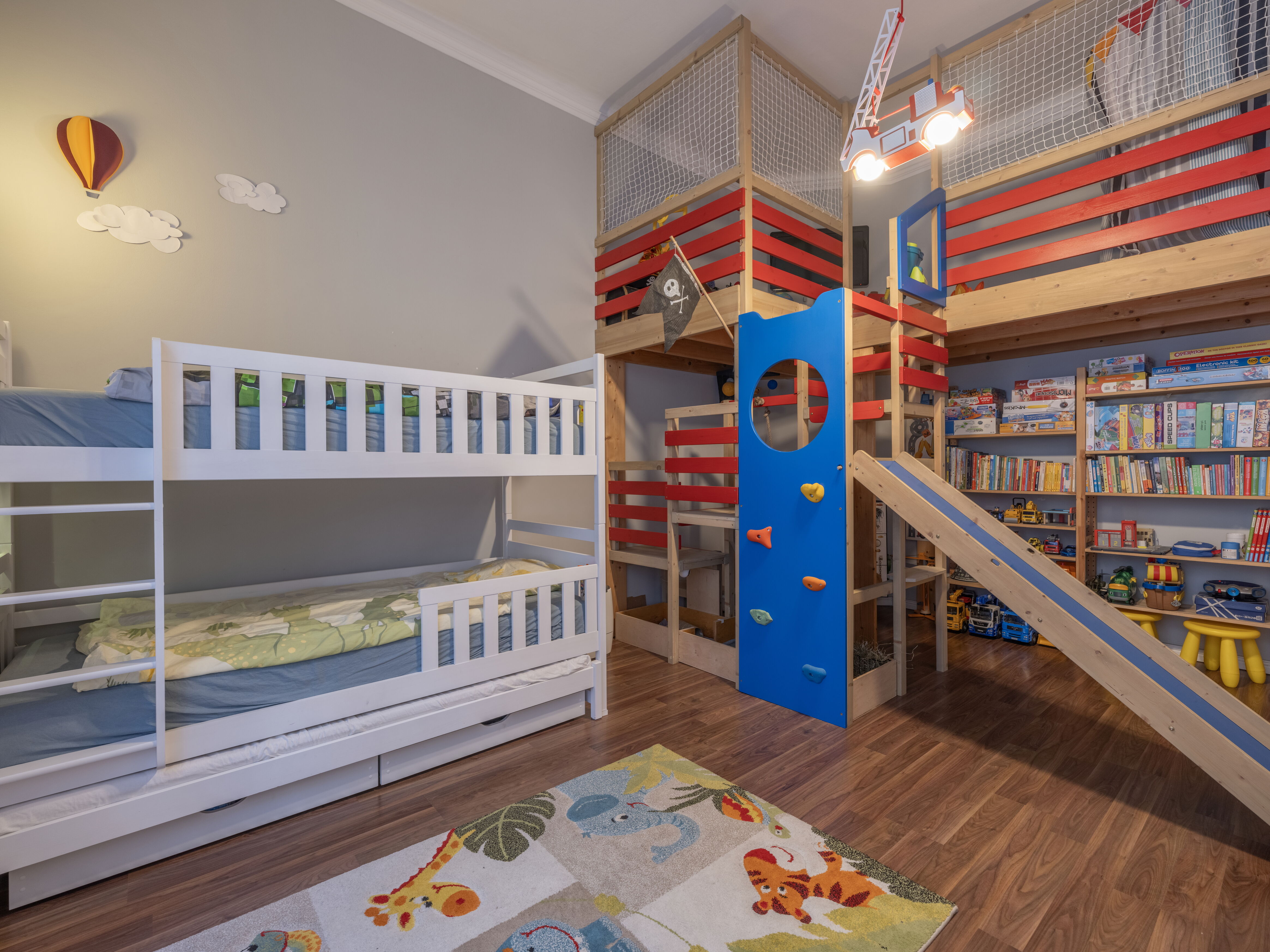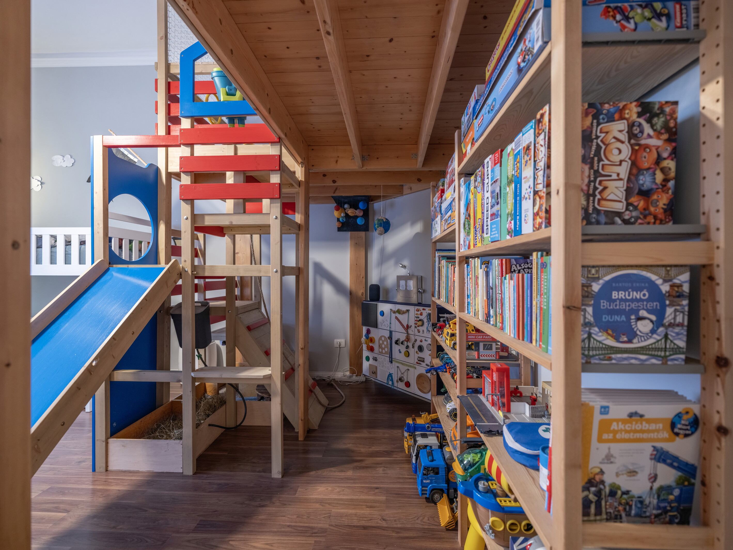 bben a nagyméretű szobában egy kisgyermekeseknek ideális, kifejezetten ide tervezett és készített strapabíró játszógaléria került. A galéria funkciója szabadon alakítható a szoba lakói életkorának és igényeinek megfelelően. A helyiségben a gyermekágyak, íróasztalok, ruha- és játéktárolók mellett magának a játéknak is jut hely. A szemnek kellemes világításról a központi fények mellett a falon futó, rejtett LED-sor gondoskodik.