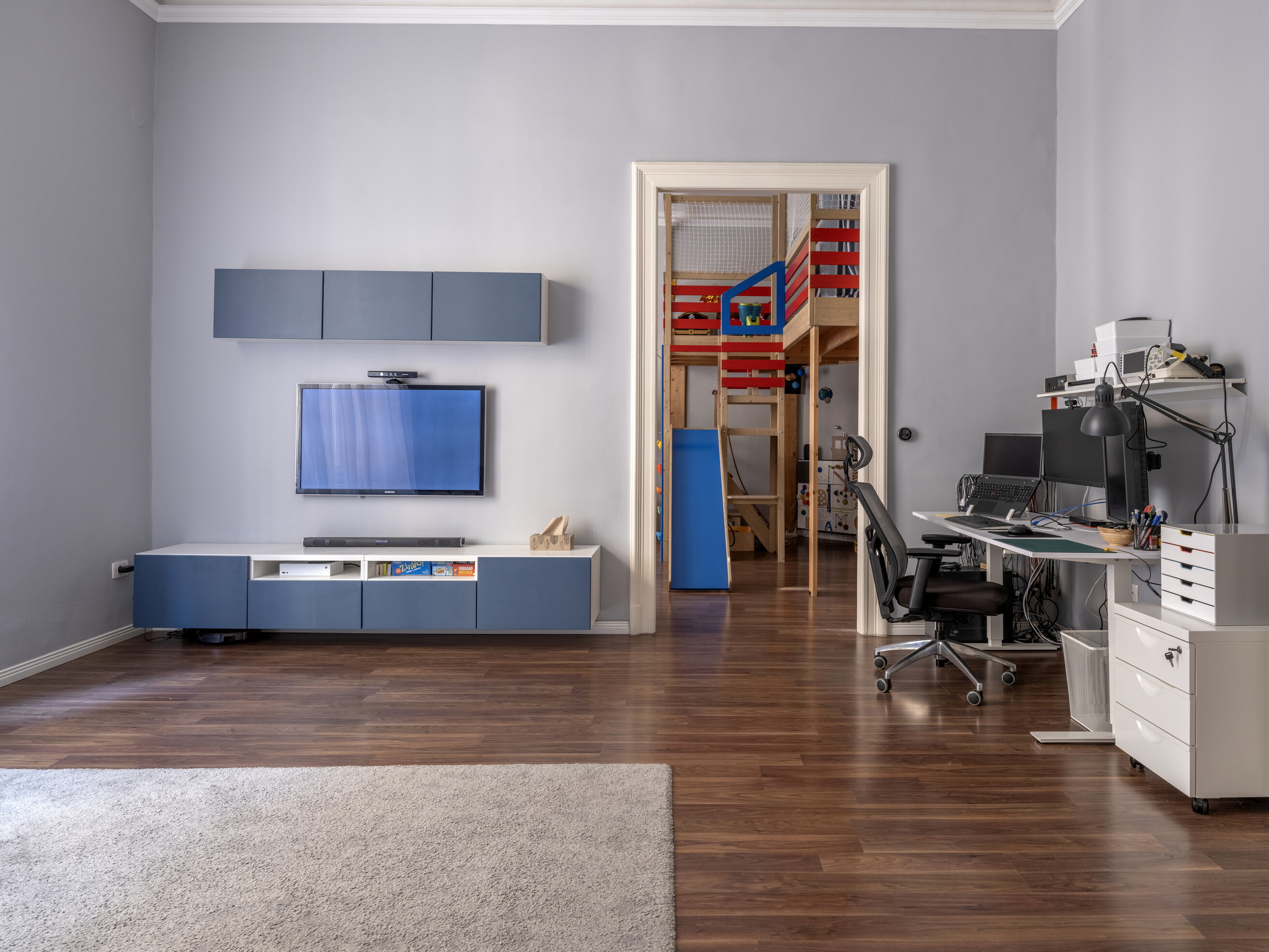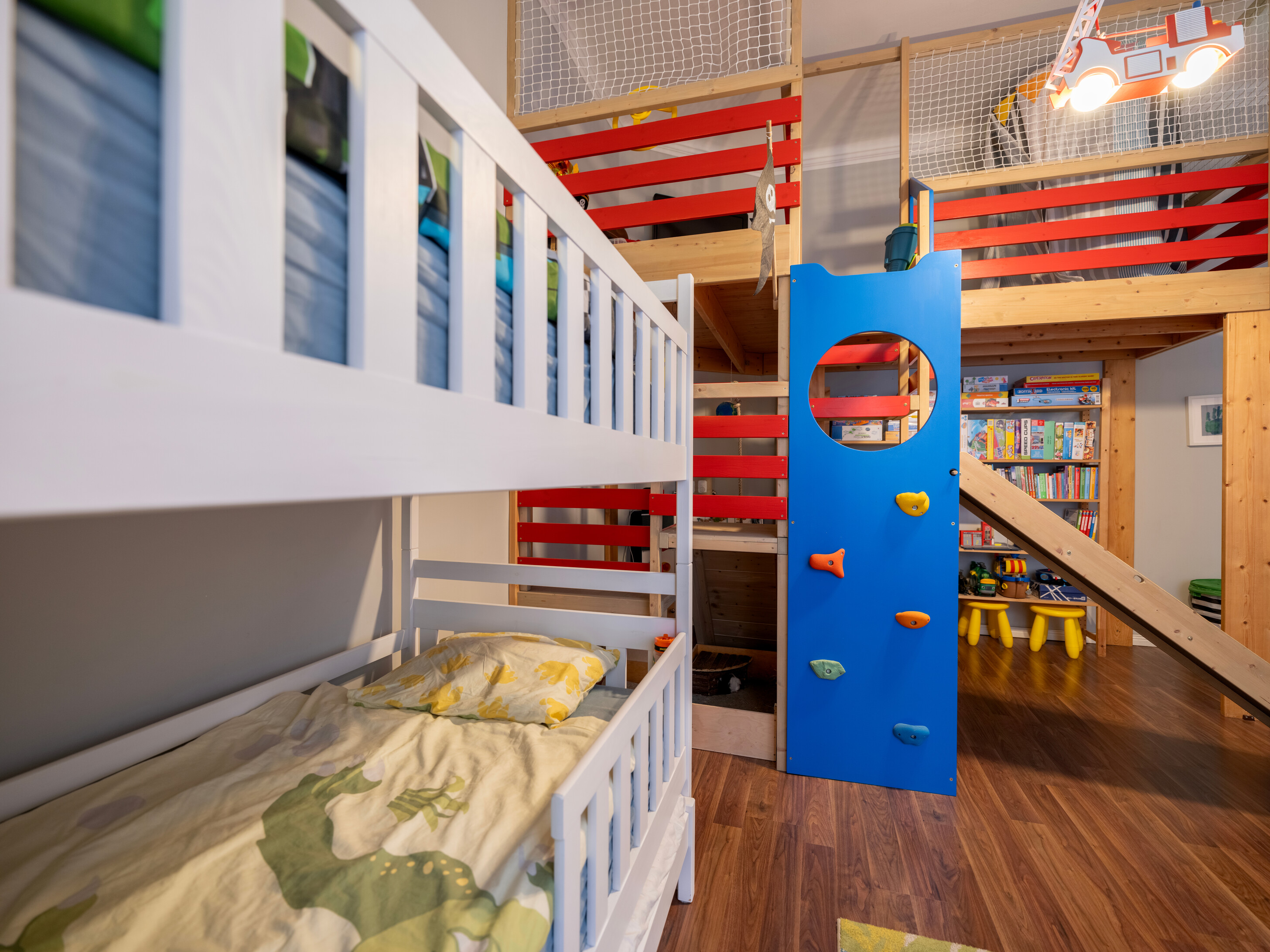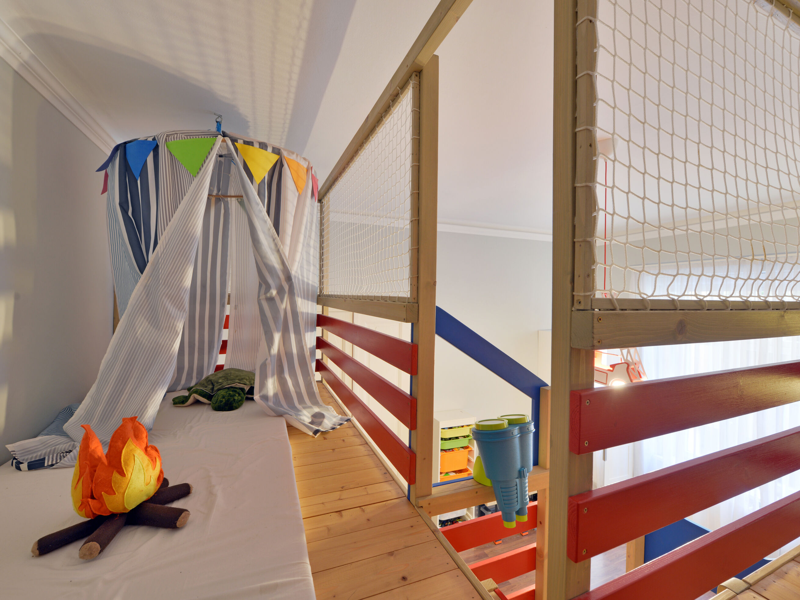 bben a nagyméretű szobában egy kisgyermekeseknek ideális, kifejezetten ide tervezett és készített strapabíró játszógaléria került. A galéria funkciója szabadon alakítható a szoba lakói életkorának és igényeinek megfelelően. A helyiségben a gyermekágyak, íróasztalok, ruha- és játéktárolók mellett magának a játéknak is jut hely. A szemnek kellemes világításról a központi fények mellett a falon futó, rejtett LED-sor gondoskodik.