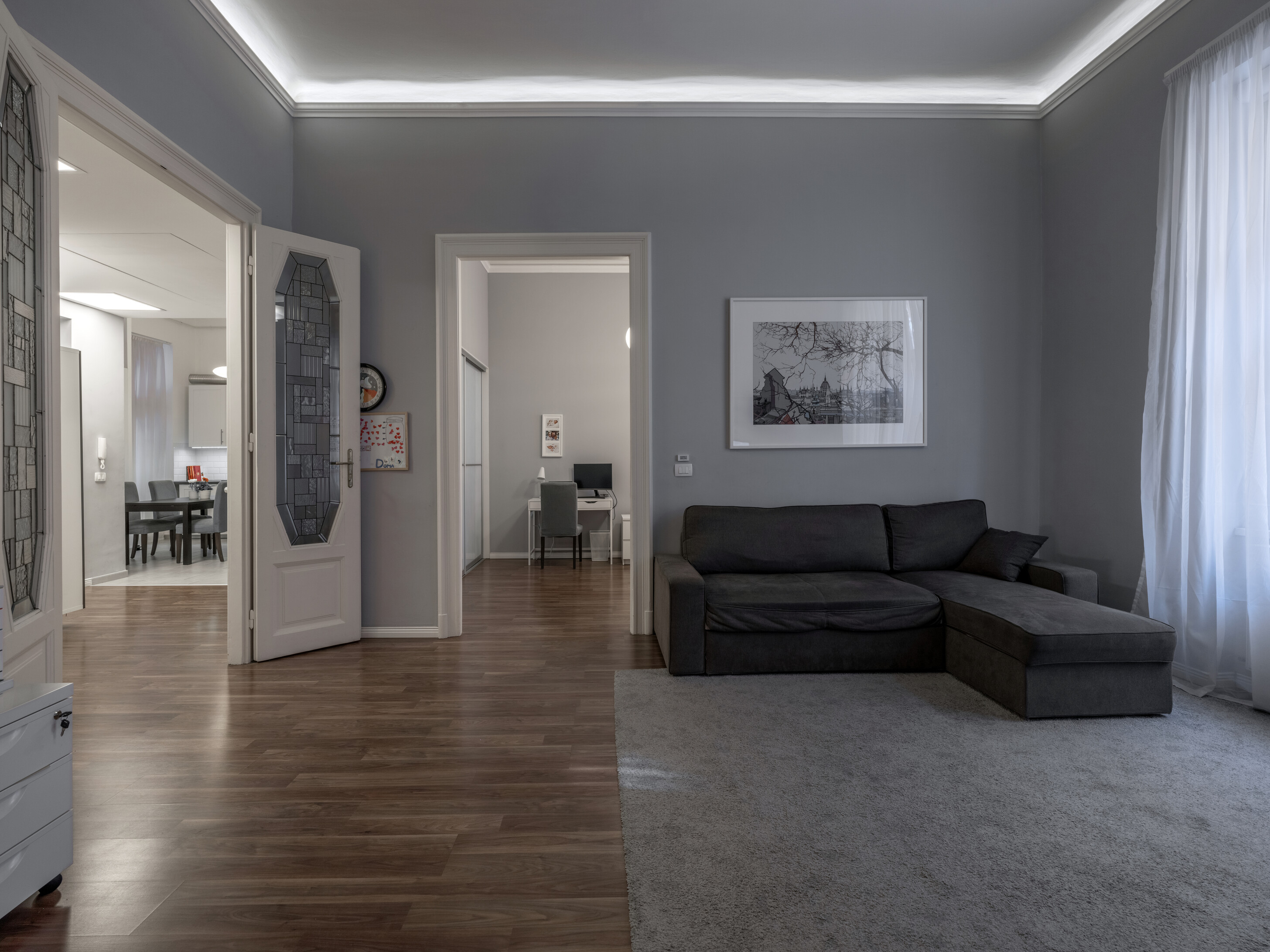 A tágas nappali a nagyméretű ablakoknak köszönhetően világos, jól szellőztethető. Az ide nyíló, igényesen felújított beltéri ajtók díszüvegeit kifejezetten úgy készíttettük, hogy azok a jelenkor életérzését csempésszék a klasszikus enteriőrbe. A hangulatvilágításról a plafon alatt húzódó, rejtett LED fény gondoskodik, mely igény esetén a külső fényviszonyokhoz igazítja a beltéri fény erősségét és színét biztosítva ezzel a szemnek és léleknek is kellemes környezetet.
