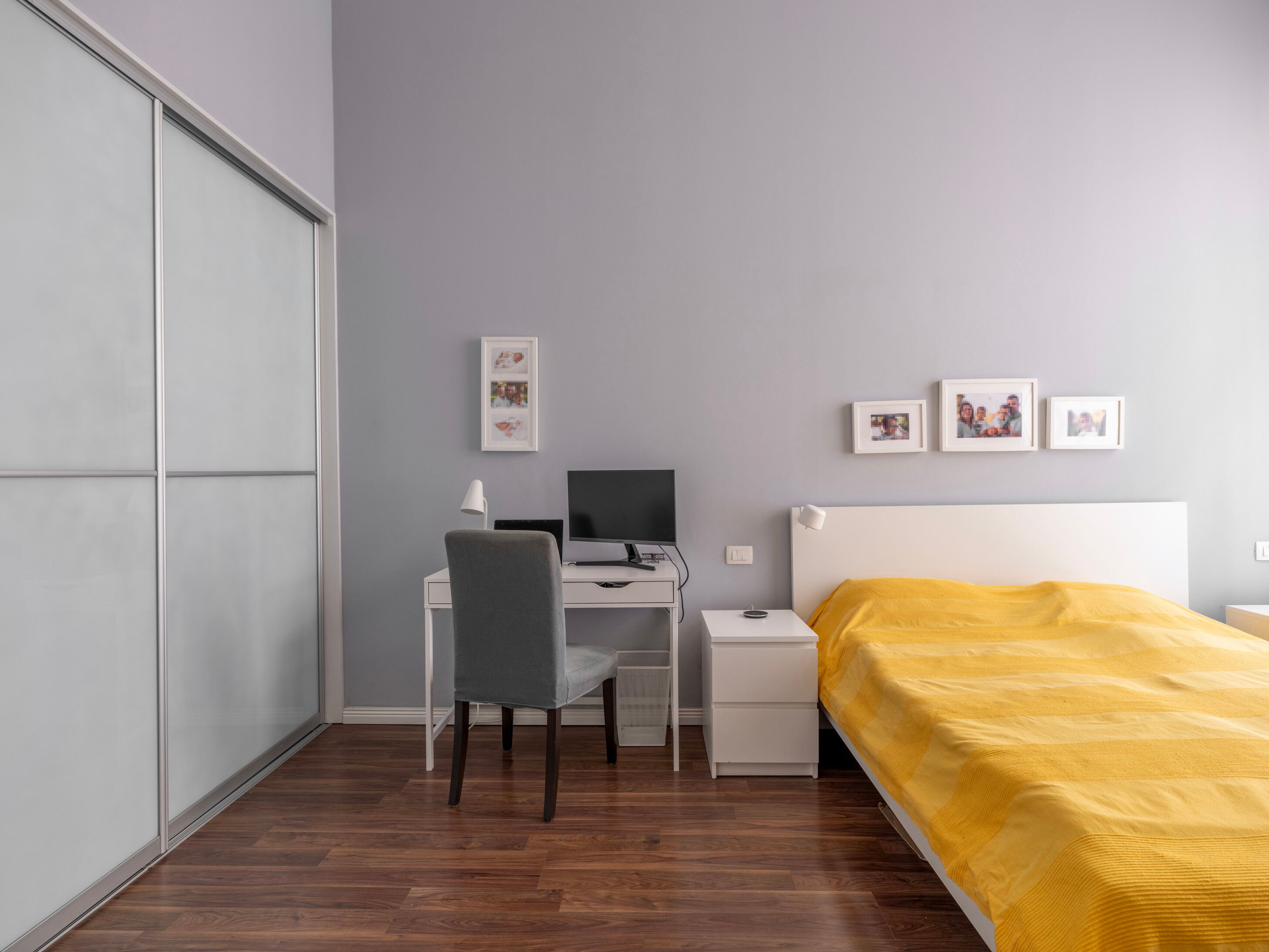 A hálószobában a szoba teljes szélességében az épített üvegajtós gardróbszekrény oldja meg a ruhakérdést, és mert szeretjük, ha mindennek megvan a helye, felette szintén kialakítottunk egy kisebb rejtett tárolót.