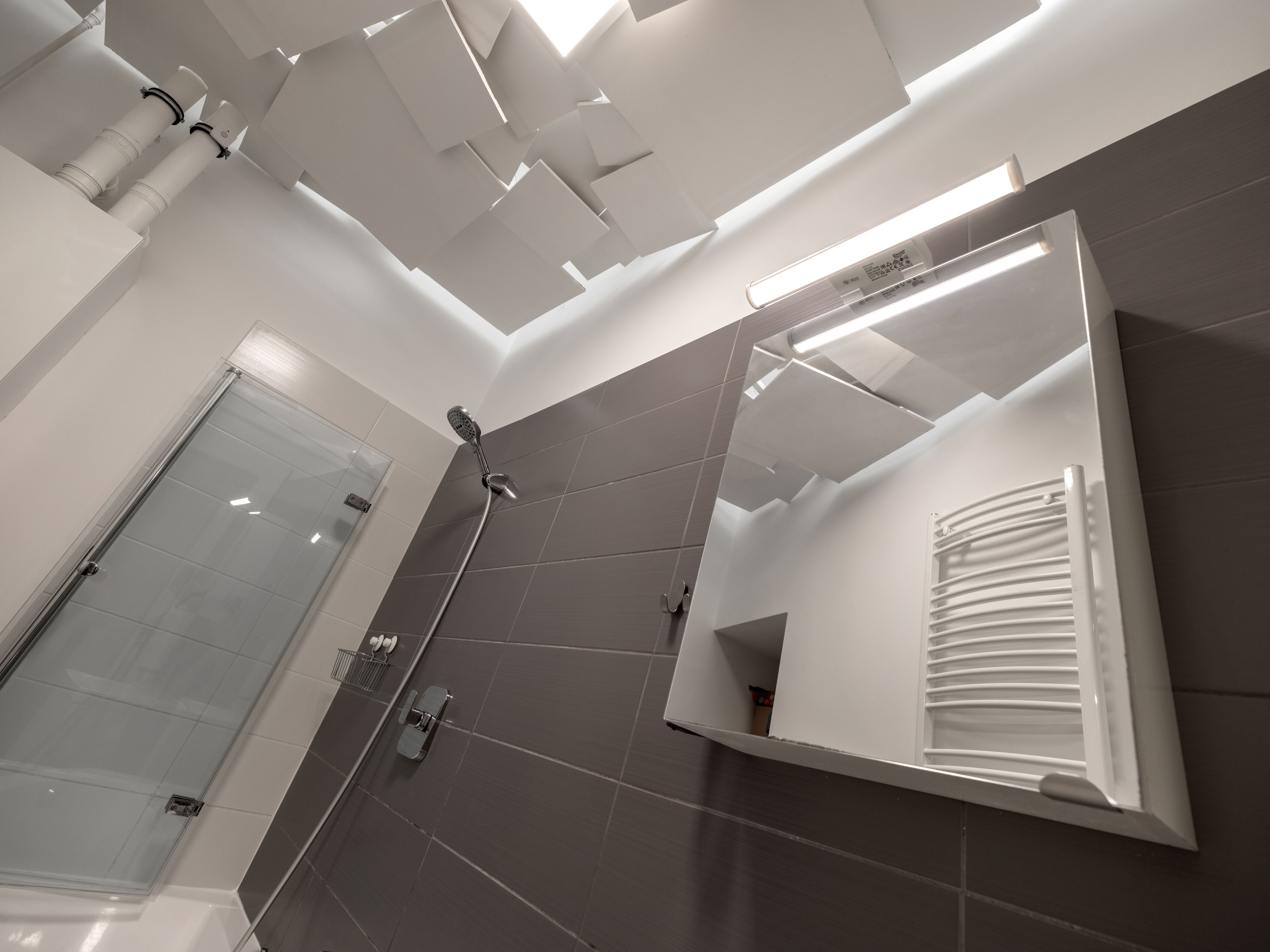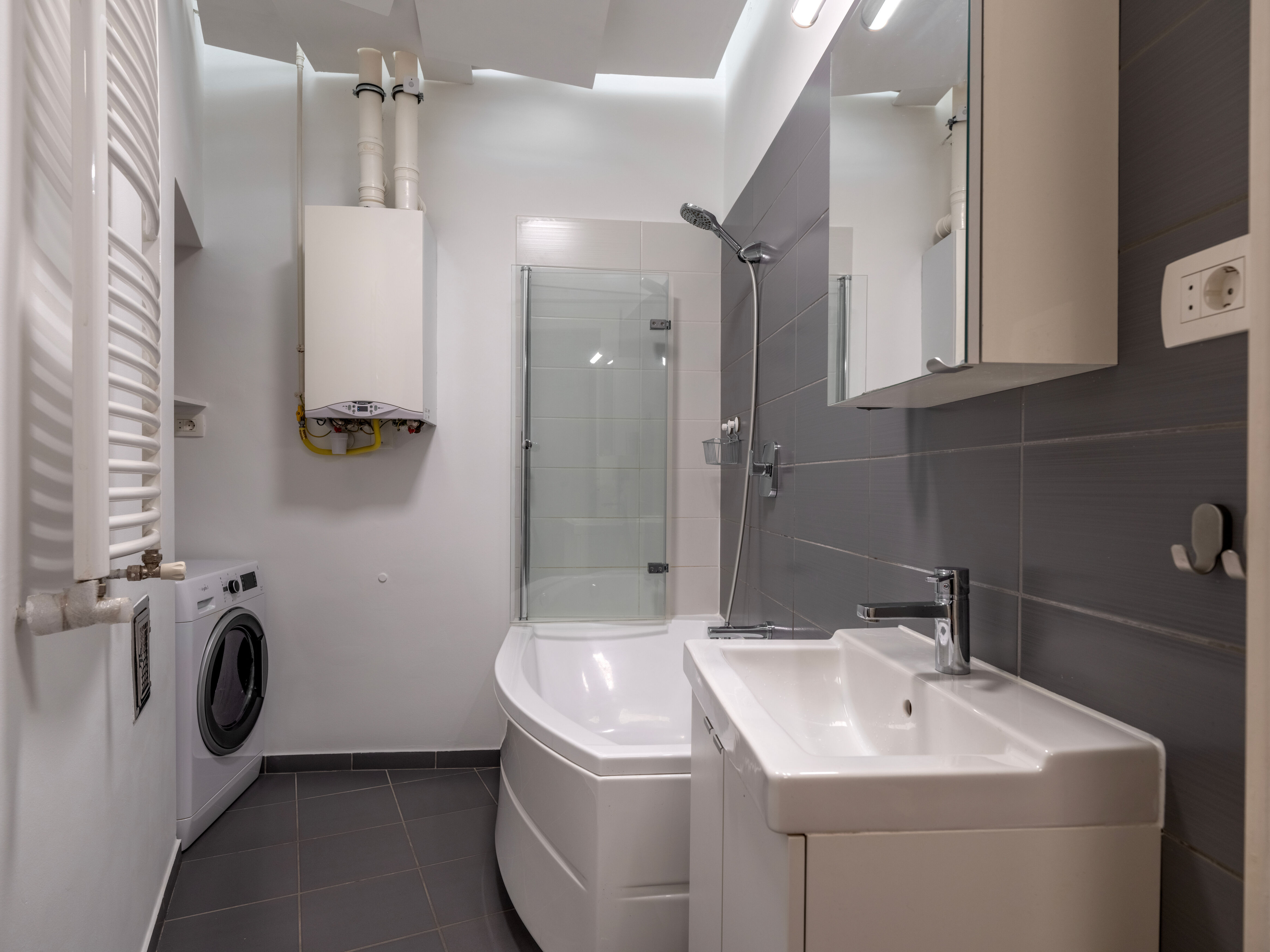A fürdőszoba és a WC külön helyiségben található, mindkettő vezérelt elszívóval és mozgásérzékelős világítással felszerelt. A fürdőszoba minőségi Kludi szaniterekkel került kialakításra. Ebben a helyiségben található a mosó- és szárítógép, illetve az Ariston kondenzációs kombi gázkazán is.